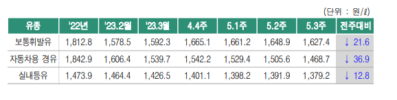 이번 주 국제 유가는 미국의 디폴트 가능성 우려와 에너지정보청(EIA)의 상업원유 재고 증가 발표 등의 요인으로 하락했다.