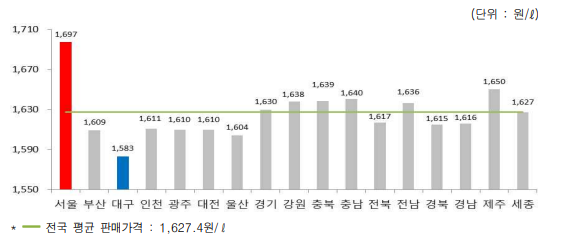 국내 최고가 지역인 서울의 이번 주 휘발유 평균 가격은 24.2원 하락한 1697.2원으로 전국 평균보다 69.9원 높은 수준이었고, 최저가 지역인 대구는 27.9원 하락한 1583.2원으로 전국 평균 가격 대비 44.2원 낮은 수준이었다.