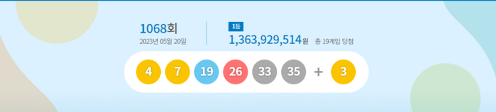 로또복권 운영사 동행복권이 5월 20일 추첨한 제1068회 로또복권에서 당첨번호 6개를 맞힌 1등 당첨자는 모두 19명으로 집계됐다.