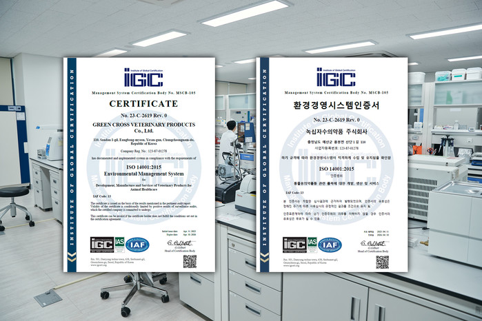 녹십자수의약품이 동물용 의약품 개발, 생산, 서비스 단계의 환경경영체계 구축에 대한 노력을 인정 받아 국제 환경경영시스템 인증인 ‘ISO 14001’ 인증을 획득했다고 23일 밝혔다.