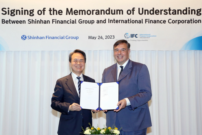 신한금융그룹이 24일 오후 서울 여의도에 위치한 페어몬트호텔에서 국제금융공사(IFC)와 글로벌·ESG 분야에서의 협업 확대를 위한 업무협약을 체결했다고 25일 밝혔다.
