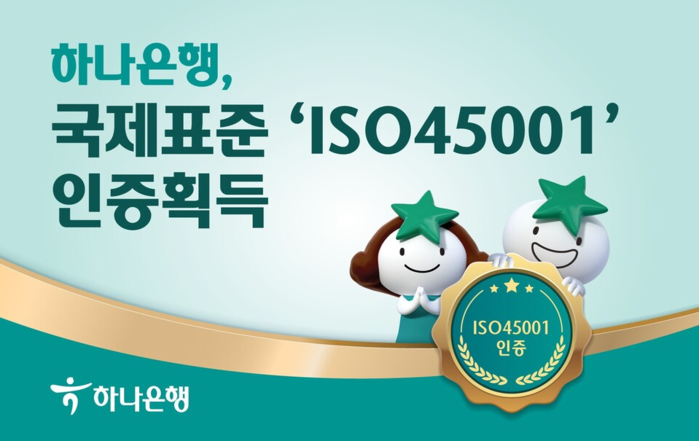 하나은행이 한국표준협회로부터 국제표준화 규격인 안전보건경영시스템 ‘ISO45001’ 인증을 획득했다고 25일 밝혔다.