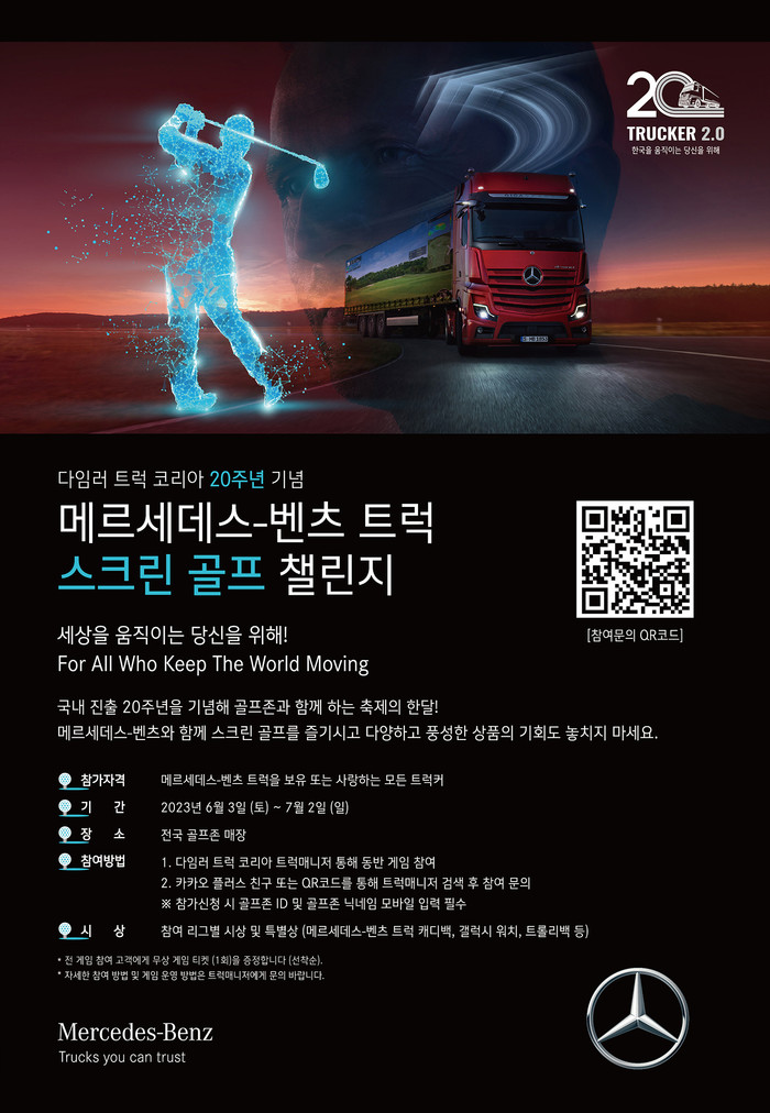 다임러 트럭 코리아가 한국 진출 20주년을 기념해 6월 3일부터 7월 2일까지 ‘메르세데스-벤츠 트럭 스크린 골프 챌린지’를 전국 골프존 매장에서 개최한다.