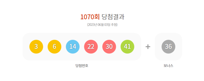 1등 당첨번호는 ‘3, 6, 14, 22, 30, 41’이며 1인당 18억5911만6929원씩의 당첨금을 수령한다.