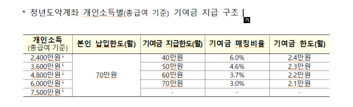기여금 매칭과 비과세 혜택은 소득 수준에 따라 달라진다. 개인소득이 6000만원 이하인 청년은 기여금과 비과세 혜택을 동시에 받을 수 있다. 게인 소득별 기여금 지급 한도(월 40만~70만원)와 매칭 비율(3.0~6.0%) 기준으로 기여금 한도가 달라진다. 예를들면 개인소득이 2400만원 이하인 가입자의 경우 지급 한도는 월 40만원, 매칭 비율은 6.0%로 매월 받을 수 있는 기여금은 최대 2만4000원이다. 개인소득이 6000만~7500만원인 경우엔 별도의 기여금 지급은 없으나, 발생한 이자소득에 대해선 비과세 혜택을 받을 수 있다.