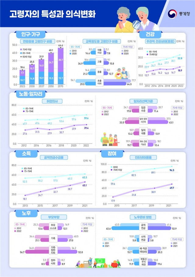 통계청이 빠르게 진행되는 고령화에 대응하기 위해 65세 이상 고령자를 연령별로 세분하여 지난 10년간 고령자의 특성과 의식변화를 분석했다.