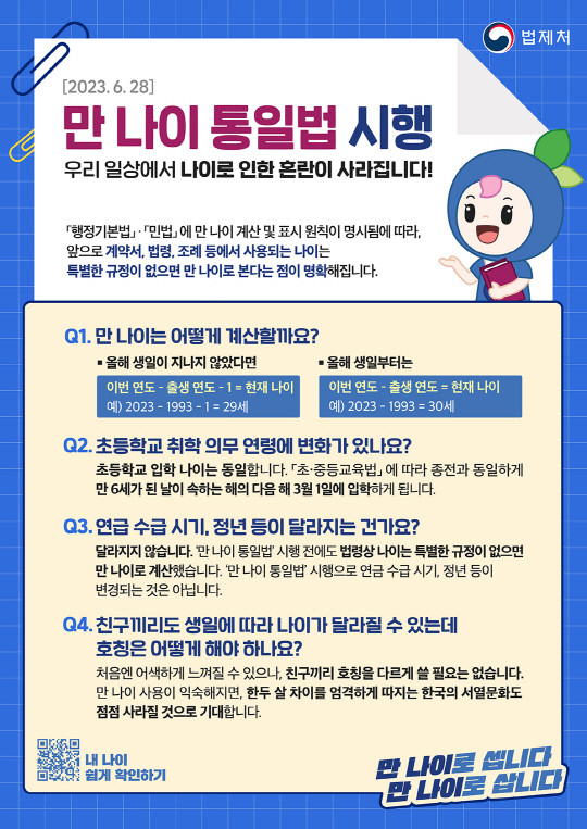 법제처에 따르면 오는 6월 28일부터 각종 법령과 계약, 공문서 등에 표시된 나이를 원칙적으로 만 나이로 쓰는 ‘만 나이 통일법’이 시행된다.