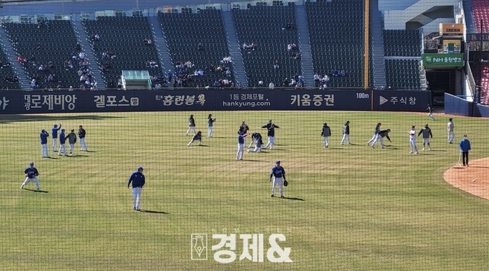 | ▲ 5회 끝난 뒤 후보선수들이 몸을 풀고 있다. |