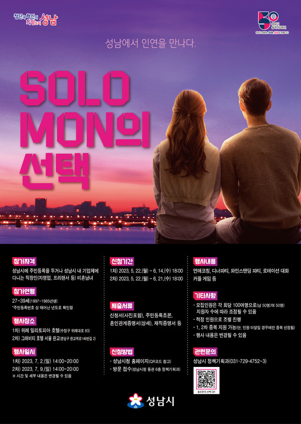 성남시, 미혼남녀 만남 '솔로몬(SOLO MON)의 선택'-지원자 1188명
