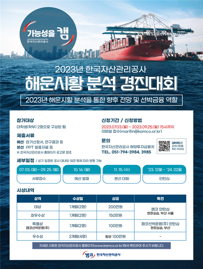 [경제엔=김지영 기자] 캠코(한국자산관리공사, 사장 권남주)는 7월 3일(월)부터 9월 25일(월)까지 대학생 대상「2023년 해운시황 분석 경진대회」참가자를 모집한다고 밝혔다.