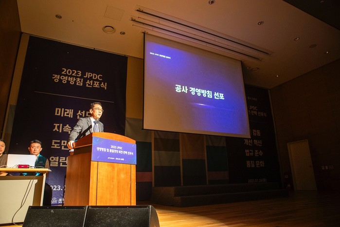 18일 제주개발공사 대강당에서 열린 선포식에서는 ‘2023 JPDC 경영방침’과 함께 ‘품질경영 비전’을 발표했다.