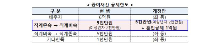 우선 ‘결혼자금 증여분에 대한 세금 공제 확대’ 방안으로 증여재산 공제 한도가 기존 5000만 원(미성년자 2000만 원)에서 혼인신고일 전후 각 2년 이내(총 4년간) 직계존속으로부터 증여받은 재산 1억원 추가 공제를 더해 총 1억 5000만 원의 증여에 대해 공제를 받을 수 있게 됐다. 이에 따라 앞으로는 양가에서 1억5000만 원씩, 총 3억 원까지 증여세 없이 결혼자금 지원이 가능해질 전망이다.