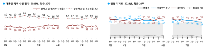 윤석열 대통령 국정 수행에 대한 여론조사 결과 긍정 평가가 35%, 부정 평가가 55%를 기록했다. 정당 지지율에서는 국민의힘이 2%포인트 상승한 데 비해 더불어민주당은 2주 연속 하락하며 20%대로 하락했다.