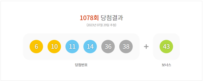 추첨 결과 1등 당첨번호는 '6, 10, 11, 14, 36, 38'이며 1인당 21억4160만 원씩의 당첨금을 수령한다.