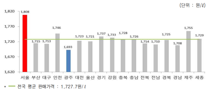 국내 최고가 지역인 서울의 이번 주 휘발유 평균 가격은 전주보다 32.6원 상승한 1808.1원으로 전국 평균 가격 대비 80.4원 높은 수준이었고, 최저가 지역인 광주는 31.6원 오른 1692.6원으로 전국 평균 가격 대비 35.2원 낮은 수준이었다.