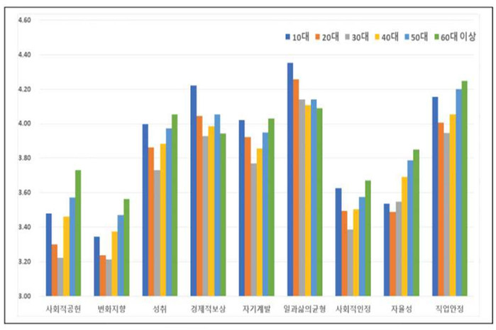 연령대별로는 20대 이하의 경우 1순위 일과 삶의 균형, 2순위 경제적 보상 순이었으나, 30-40대는 1순위가 일과 삶의 균형, 2순위 직업안정, 50대 이상에서는 직업안정이 가장 높았고 일과 삶의 균형이 다음 순으로 다소 차이를 보였다.