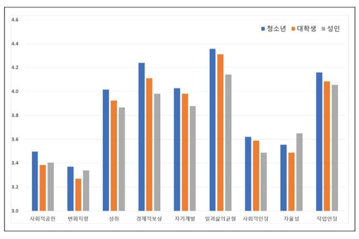청소년과 대학생은 1순위를 일과 삶의 균형, 2순위 경제적 보상, 3순위 직업안정 순으로 선택한 반면 성인(대학생 제외)은 일과 삶의 균형, 직업안정, 경제적 보상 순으로 답했다.