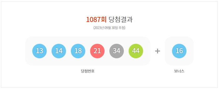 추첨 결과 1등 당첨번호는 '13, 14, 18, 21, 34, 44' 이며 1인당 17억3225만 원씩의 당첨금을 수령한다.