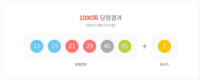 추첨 결과 1등 당첨번호는 '12, 19, 21, 29, 40, 45' 이며 1인당 23억8649만 원씩의 당첨금을 수령한다.