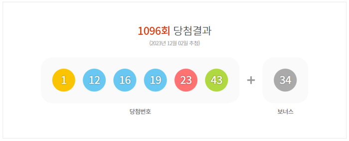 추첨 결과 1등 당첨번호는 '1, 12, 16, 19, 23, 43' 이며 1인당 25억3939만 원씩의 당첨금을 수령한다.