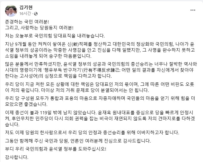 국민의 힘 김기현 대표직 사임, 페이스북으로 알려......