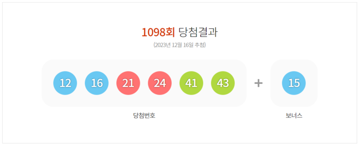 추첨 결과 1등 당첨번호는 '12, 16, 21, 24, 41, 43' 이며 1인당 19억3046만 원씩의 당첨금을 수령한다.