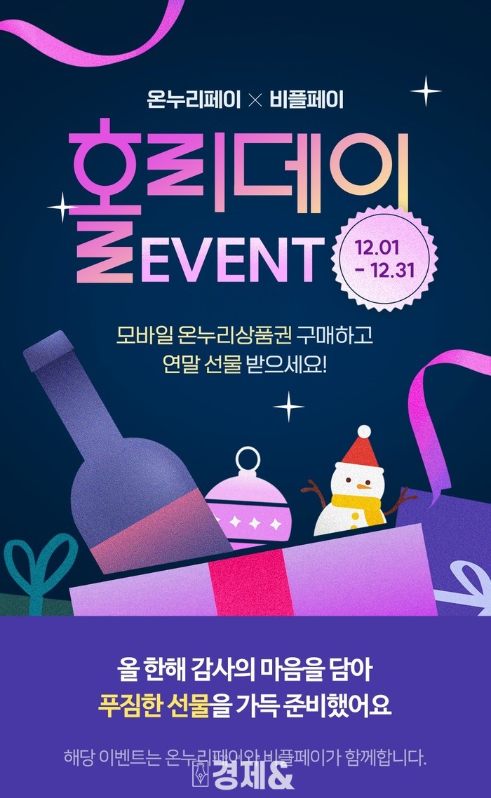[경제엔=양순미 기자] Expense 비용관리 Total 솔루션 비즈플레이(대표 김홍기)가 연말을 맞아 모바일 온누리상품권 구매 고객 대상 ‘홀리데이 이벤트’를 진행한다고 19일 밝혔다.