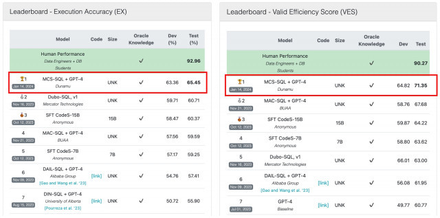 | ▲ 두나무 머신러닝팀, BIRD-SQL 글로벌 리더보드 1위 |
