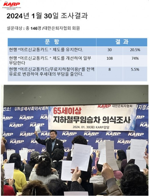 주명룡 KARP대한은퇴자협회 대표는 “군사정권이 노년층에 대한 시혜적 차원에서 시작한 도시의 지하철 무임승차 제도는 이제 개선돼야 한다. 더 이상 갖가지 이유가 있을 수 없다. 65세 이상 인구 150만명대의 정책이 1000만명 시대의 정책과 같을 수 없다. 또, 명목상에는 없지만 기초연금 속에는 교통 보조비가 포함돼 있다. 무임승차로 받는 보이지 않는 사회적 차별에서도 벗어날 수 있는 New Old의 모범을 보여줘야 할 때”라고 강조했다.