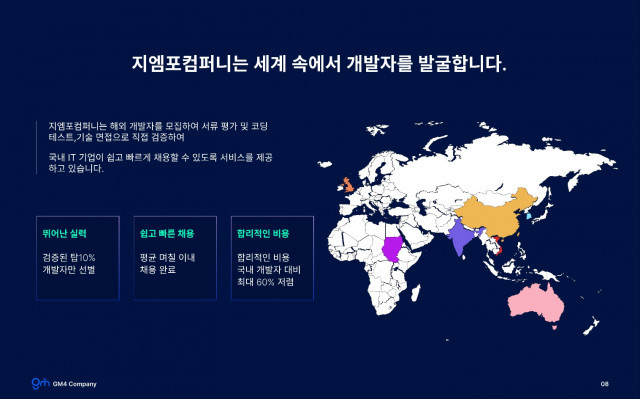 지엠포컴퍼니, 해외 개발자 중심의 혁신적 개발팀 구독 서비스 론칭 - - 해외 고스펙 개발자 중심으로 한 개발팀 구독 서비스 - 개발자 채용 시 발생할 수 있는 리스크 부담 덜어 인기