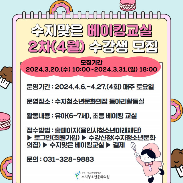 [경제엔=윤재우 기자] 용인시청소년미래재단(이사장 이상일) 수지청소년문화의집은 3월 20일(수) 10시부터 3월 31일(일) 18시까지 ‘수지맞은 베이킹교실’ 2기를 모집한다.