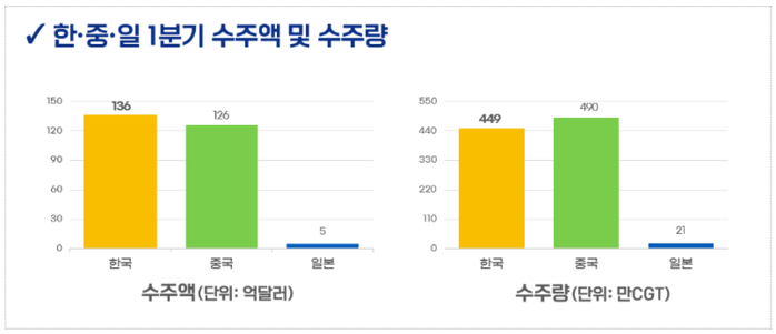 1분기 수주량의 경우 우리나라는 449만CGT(표준환산톤수)로 중국(490만CGT) 보다 다소 적지만 전년 동기대비 한국은 32.9% 증가, 중국은 0.1% 감소하여 한국 조선산업은 성장세를 이어 갔다.