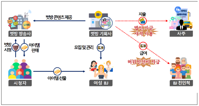 이처럼 시청자를 속이며 벌어들인 수입으로 벗방 방송사.기획사의 사주와 BJ는 명품·외제차·고급 아파트 등 호화 생활을 누렸으며, 거짓 세금계산서를 수취하거나 친인척에게 인건비를 지급한 것처럼 꾸며 허위 경비를 계상하고, 과세사업자임에도 면세사업자로 위장하여 부가가치세를 전액 탈루하기도 했다.