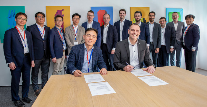 | ▲ LG화학 김동춘 전자소재사업부장(앞줄 왼쪽)과 베바스토 얀 헤닝 멜펠트(jan henning mehlfeldt) 첨단 유리 사업 총괄(앞줄 오른쪽) |