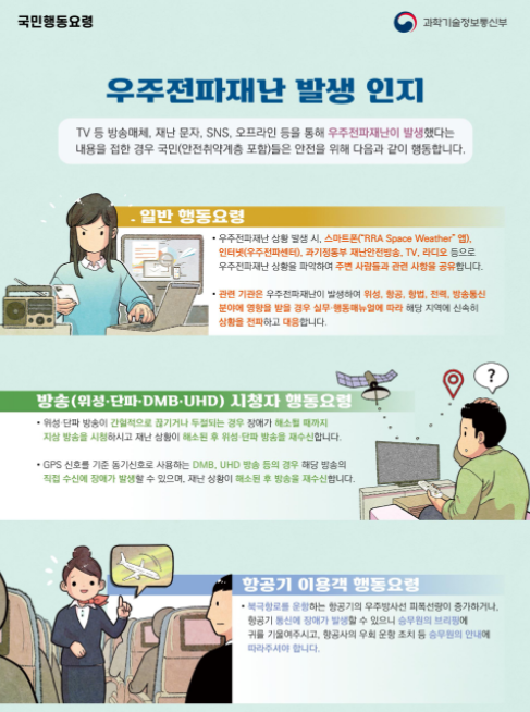 과기정통부와 소속 국립전파연구원 우주전파센터에서는 우주전파재난 매뉴얼에 따른 비상체계를 가동하면서, 항공・항법(국토교통부)・전력(산업통상자원부)・해양(해양수산부) 등 분야에서 발생 가능한 피해상황을 모니터링하고 있다.