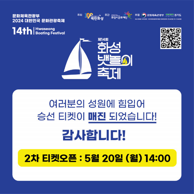 [경제엔=온라인팀] 화성시문화재단은 오는 5월 31일(금)부터 6월 2일(일)까지 화성시 전곡항에서 열리는 ‘제14회 화성 뱃놀이 축제’의 세일링 요트 및 다양한 승선 체험 프로그램의 티켓 판매가 5월 13일 오후 2시부터 티켓링크를 통해 진행된 가운데 티켓이 오픈되자 마자 단 5분만에 매진되며 화성시 대표 축제이자 2024-2025 문화관광축제로서의 면모를 여실히 보여줬다고 밝혔다.