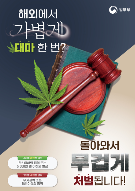 이에 법무부는 해외로 출국하는 우리 국민이 대마 합법 국가에서 대마 등 마약류 이용을 방지하고 마약 이용에 대한 경각심을 고취하고자 ‘해외 마약류 이용 방지 캠페인’을 진행할 계획이라고 밝혔다.