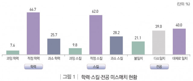 자신의 교육 수준이 일의 내용 수준보다 높다는 응답(과잉 학력)은 7.6%, 낮다는 응답(과소 학력)은 25.7%로 각각 나타났다.