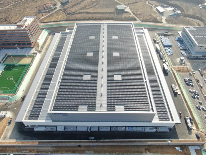 | ▲현대엘리베이터 충주 스마트 캠퍼스 내 물류센터 지붕에 설치된 태양광 발전시설 / 사진=현대엘리베이터 제공 |