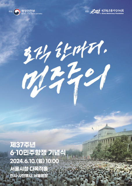 [경제엔=박민지 기자] ‘제37주년 6·10민주항쟁 기념식’이 6월 10일(월) 오전 10시 서울시청 다목적홀에서 행정안전부(장관 이상민) 주최, 민주화운동기념사업회(이사장 이재오) 주관으로 개최된다.