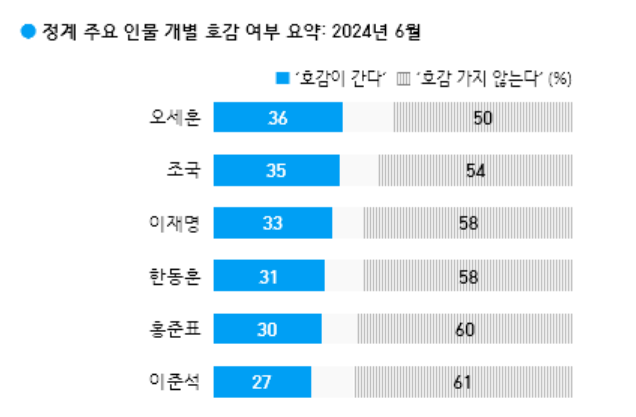 한국갤럽은 주요 정치인에 대한 호감도 조사 결과, 오세훈 시장 36%, 조국 대표 35%, 이재명 대표 33%, 한동훈 전 비대위원장 31%, 홍준표 시장 30%, 이준석 의원 27%를 기록했다고 21일 밝혔다.