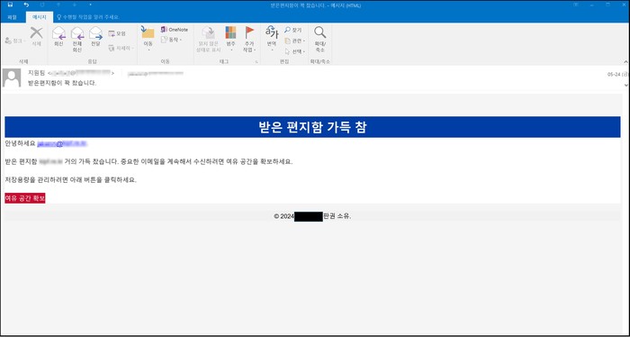 먼저 ‘이메일 저장용랑 관리’ 안내 메일로 위장한 피싱 메일에서는 ‘받은편지함이 꽉 찼습니다’라는 제목의 피싱 메일을 유포한 후 메일 본문에는 ‘받은 편지함이 가득 차 저장용량이 부족하다’며, ‘중요한 이메일을 계속해서 수신하려면 여유 공간을 확보하라’는 내용을 적어 ‘여유 공간 확보’ 버튼을 클릭하도록 유도했다.