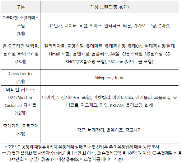 2단계 서면실태조사 대상으로 선정한 ‘쇼핑’ 분야 주요 브랜드는 총 40개로, 최근 유통 관련 정부 실태조사 대상 브랜드 17개 및 주요 카테고리별 상위 브랜드 38개를 합하고, 이 중에서 중복 브랜드 15개를 제외했다.