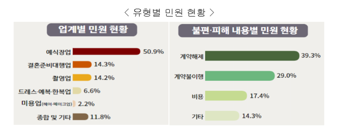민원유형 중 업계별로는 ▴예식장업(514건) ▴결혼 준비 대행업(144건) ▴촬영업(143건) ▴드레스·예복·한복업(67건) ▴미용업(22건) 순이며, 소비자 불편 및 피해 내용별로는 ▴계약해제(397건) ▴계약불이행(293건) ▴비용(176건) 등의 순으로 나타났다.