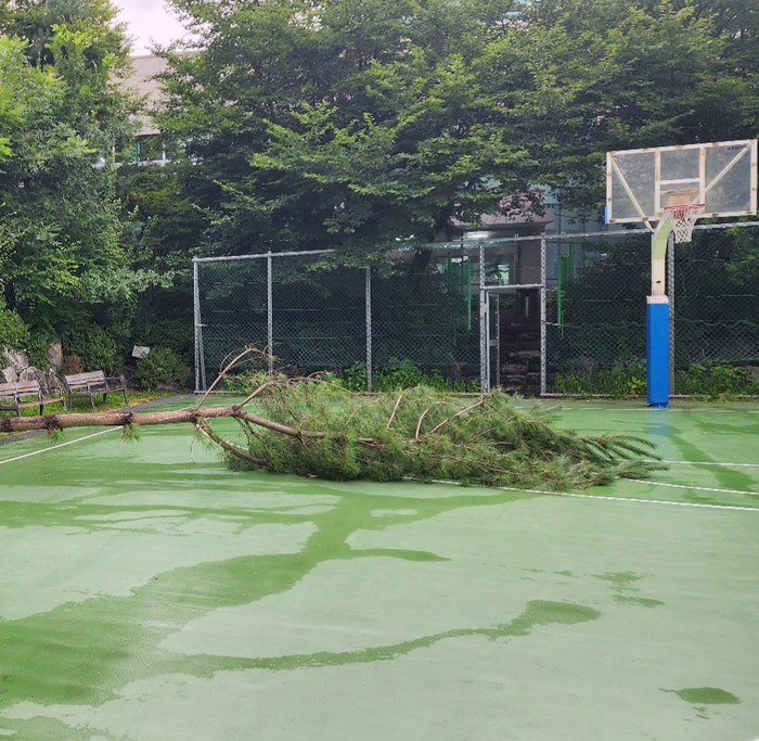공릉동 야외 농구장에 쓰러진 대형 트리나무. 유난히 강한 돌풍과 장맛비가 동반되고 있다