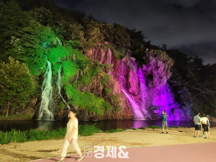 낮보다 화려한 서대문구에서 설치한 인공폭포인 홍제폭포, 더운 날씨로 인해 사람들이 시원함을 만끽하기 위해 나와 산책하고 있다.