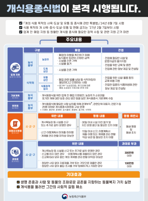 농림축산식품부가 8월 7일부터 ‘개의 식용 목적의 사육·도살 및 유통 등 종식에 관한 특별법(개식용종식법) 시행령안’을 시행한다고 밝혔다. 이번 시행령안은 지난 2월 6일 제정된 개식용종식법에서 위임된 사항과 그 시행에 필요한 사항들을 포함하고 있다.