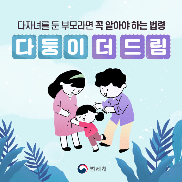 정부는 최근 저출생 기조에 적극적으로 대응하기 위해 다자녀 가구에 대한 지원을 확대하고 있다. 특히 다자녀 가구의 기준도 기존 3자녀 이상에서 2자녀 이상으로 완화됨에 따라 법제처가 다자녀를 둔 부모들이 꼭 알아야 할 법령과 제도를 소개했다.