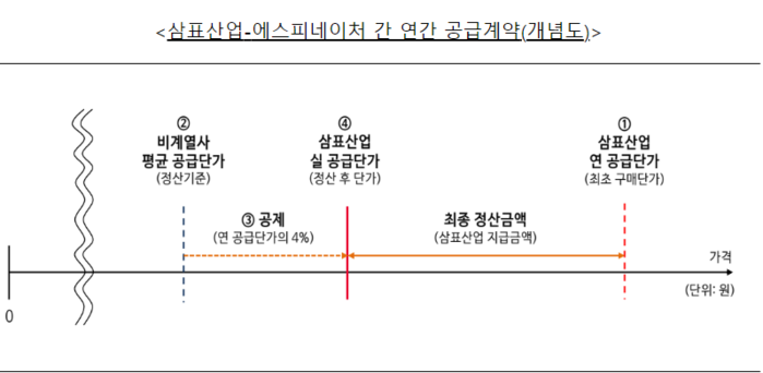 삼표산업은 2016년 1월부터 2019년 12월까지 국내 분체시장 거래물량의 7~11%에 이르는 물량을 에스피네이처로부터만 전량 구입하면서, 에스피네이처가 비계열사에 판매할 때 보다 오히려 높은 단가에 분체를 구입했다.