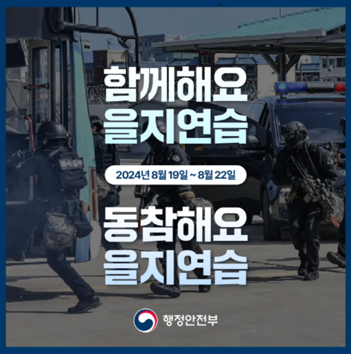이번 을지연습은 한·미 연합 군사연습과 연계해 ‘을지 자유의 방패(을지프리덤실드)’라는 명칭으로 시행되며, 읍·면·동 이상 행정기관과 공공기관·단체, 중점관리대상업체 등 약 4천 개 기관, 58만 명이 참여한다.